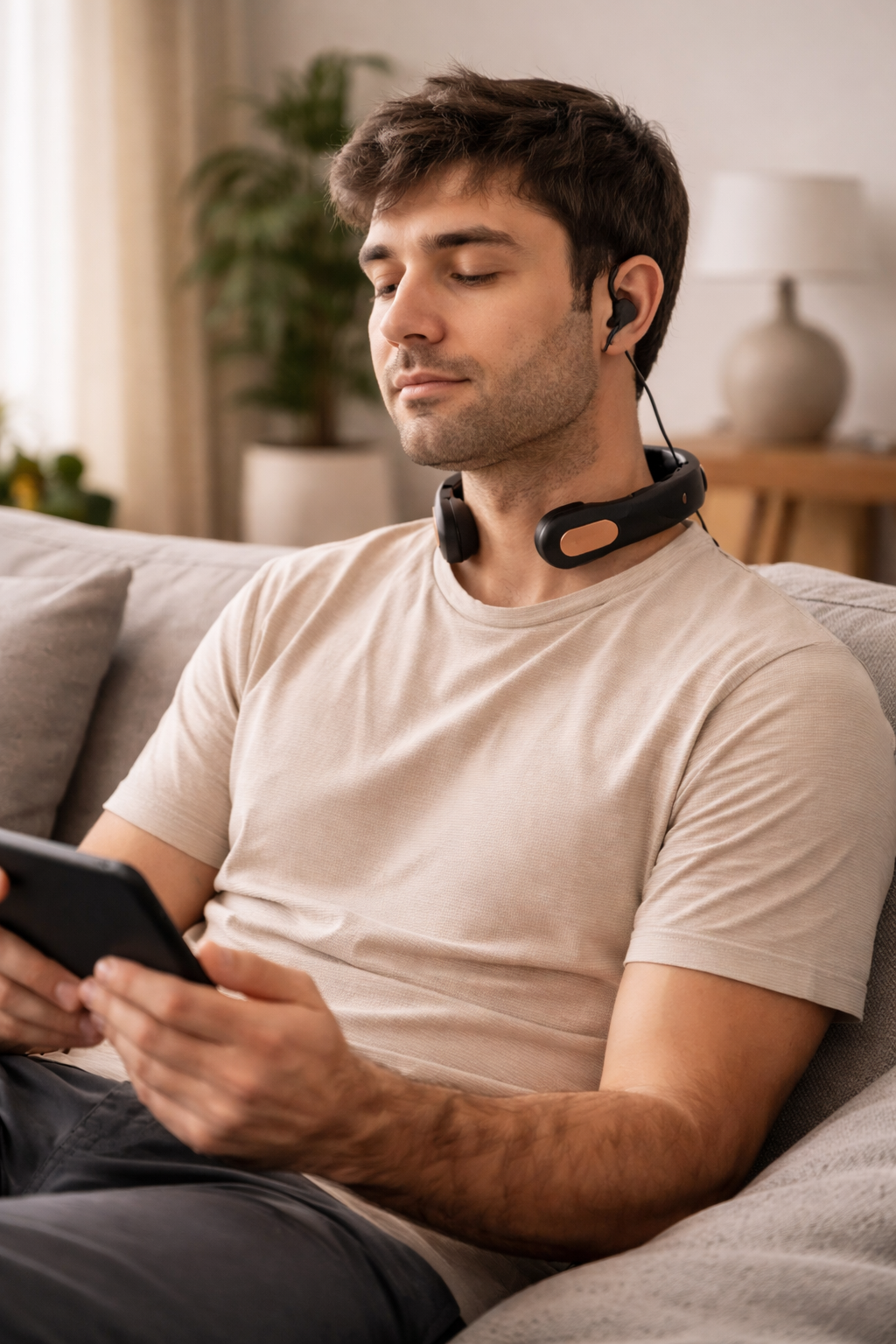 A precision wellness device designed to gently stimulate key neural pathways—supporting calm, focus, and nervous system balance.